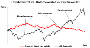 Anhand der vorhandenen Informationen kann der sogenannte „faire“ beziehungsweise wahre Wert eines Unternehmens festgestellt werden. Man möchte damit herausfinden, ob die Aktie eines Unternehmens überbewertet, unterbewertet oder fair bewertet ist. Wenn sie unterbewertet ist, bekommt man sozusagen „mehr Wert für weniger Geld“.
