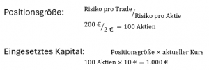 Dein gesamtes Anlagekapital beträgt 10.000 €. Davon willst Du lediglich 2 % pro Trade riskieren also 200 €. Du möchtest nun einige HSBC-Masterclass Aktien kaufen, welche bei 10 € notieren. Durch die Festlegung Deines Risikos von 2 € pro Aktie ist gleichzeitig auch Dein Stop-Loss definiert. Dieser liegt für die HSBC-Masterclass Aktie bei 8 €. Anhand dieser Zahlengrößen kannst Du nun Deine Positionsgröße und Dein eingesetztes Kapital bestimmen: