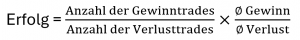 Um erfolgreich an der Börse zu handeln, solltest Du bestimmte Denkweisen ändern. Vermeide den typischen Fehler, dass Du deine Verluste nicht begrenzt und sie stattdessen weiterlaufen lässt. Dieser verheerende Fehler entsteht aus Deinem Willen, an der Börse Recht haben zu wollen. Damit ist die Hoffnung verbunden, dass aus Deinen Verlusten irgendwann wieder Gewinne werden. Auf ähnliche Weise begrenzt Du dann auch voreilig Deine Gewinne, nur um sicher zu sein, dass Du sie behalten kannst. Diese Verlustaversion verhindert jedoch auf lange Sicht Deinen Erfolg. Eine hohe Trefferquote bedeutet nicht zwangsläufig einen hohen Gewinn. Wenige jedoch unbegrenzt hohe Verluste können alle Deiner eingebrachten Gewinne wieder vernichten. Die Erfolgsformel lässt sich demnach wie folgt bestimmen: